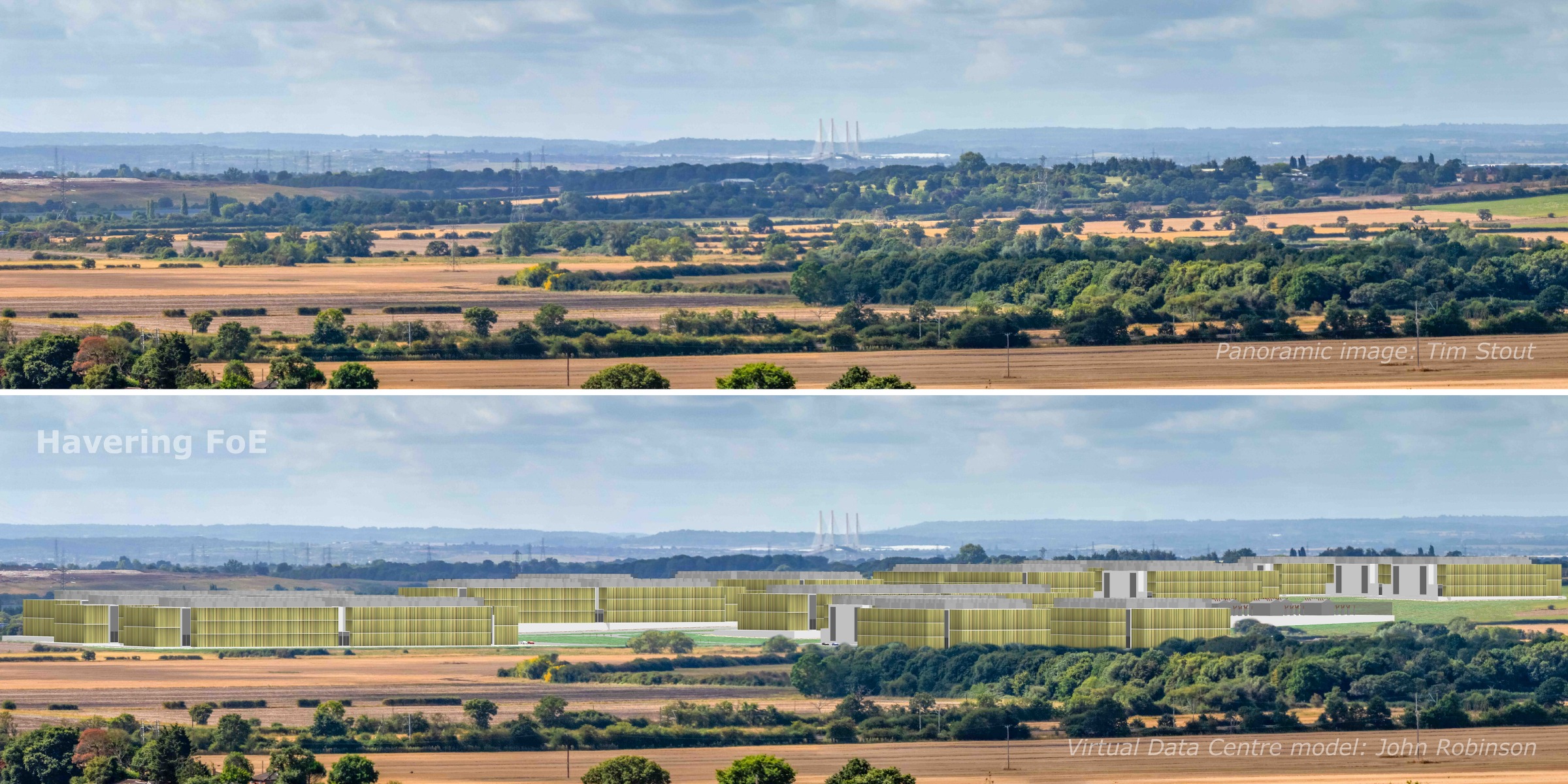 The second comparison is based on part of a panoramic photo, looking south from Jury Hill in Thorndon Park. The Dartford Crossing can be seen in the distance. No amount of camouflage can disguise the blot that this development would create on an otherwise unspoilt rural landscape.