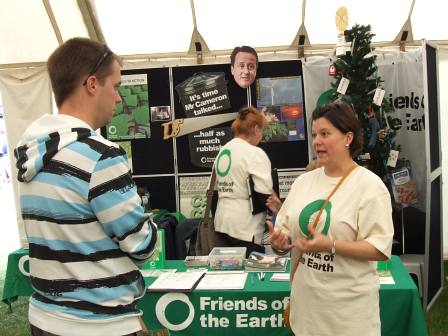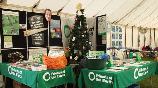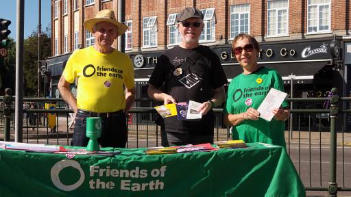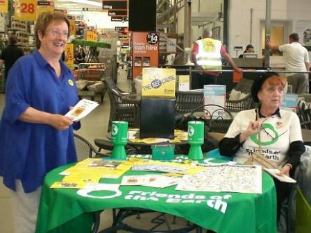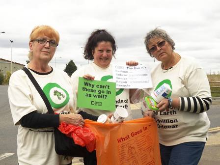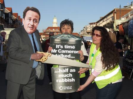 One of our first campaigns targeted both the government (to reduce non-recycled domestic waste by 50 percent) and our council (to increase the range of plastics its contractor accepted for recycling). Friends of the Earth produced a brilliant kit of printed images - dustbin, saw, and David Cameron's face - for local groups to stick onto shapes cut from corrugated cardboard. With the help of our Val's friend Jim (the man in a suit) we staged the dustbin stunt in Romford Market Place; later in the year we made our point about plastics outside the recycling plant in Rainham. Both events received good press coverage.